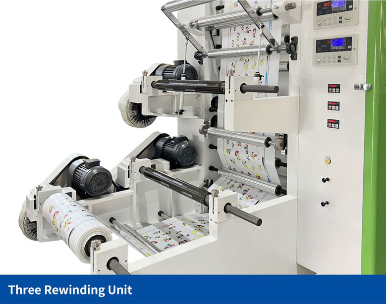3. Flexibility: The three-unwinder, three-rewinder stacked flexo press can handle a wide variety of substrates, such as paper, cardboard, plastic film, and other materials, making it perfect for printing different products.